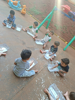 A atividade com amido de milho e água proporcionou momentos de exploração sensorial, onde as crianças puderam sentir diferentes texturas, observar mudanças de consistência e desenvolver a coordenação motora e a percepção tátil de forma lúdica e divertida. 🌽👐