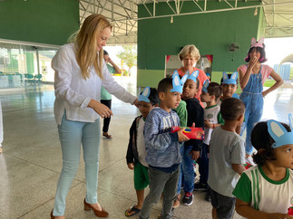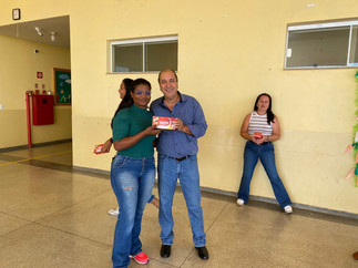 A prefeita municipal Mireli Martins o vice Jair Nunes e a Secretária da Educação, Larissa Martin, participaram da entrega dos chocolates nas escolas.