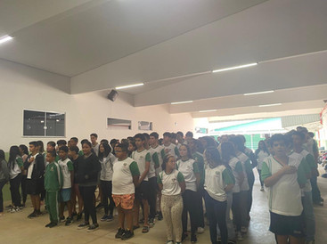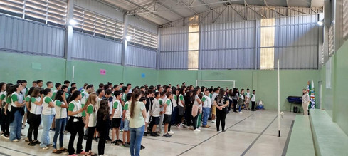 A execução do Hino Nacional com o tema: “Agosto Lilás”, com a apresentação de um texto informativo realizado pelos alunos do 8º ano verde, sob a orientação das professoras Angélica e Larissa.