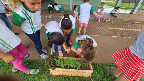 Também participaram de brincadeiras e atividades divertidas, como a criação do jogo da velha do girassol, além de plantarem suas próprias mudinhas com muito entusiasmo.